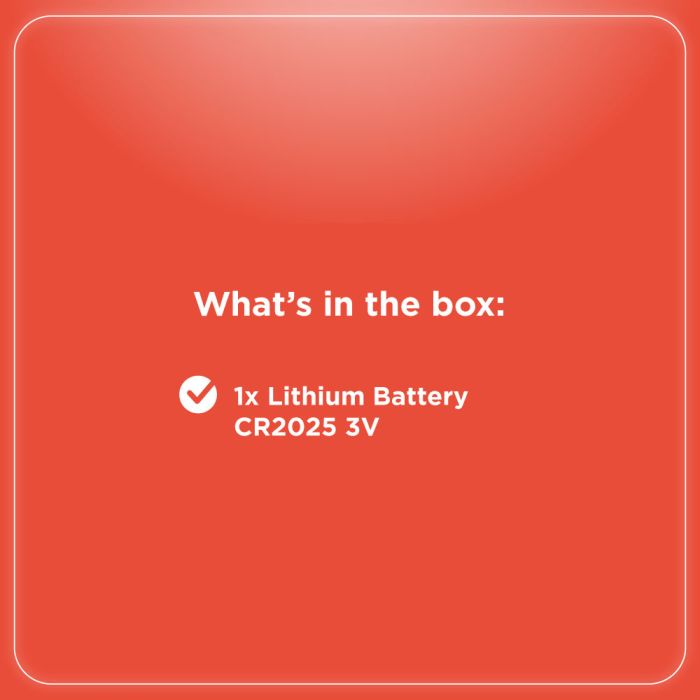 This CR2025 lithium battery is a reliable power solution engineered to meet the diverse needs of today's electronic devices. With a 3V output, it delivers consistent and long-lasting power, making it perfect for items such as key fobs, remote controls, digital thermometers, and small electronic gadgets. Crafted with precision and durability in mind, it ensures dependable operation, providing peace of mind for your daily activities. Its high energy density is designed to deliver extended runtime, reducing the frequency of battery replacements, and minimizing disruptions to your routine. Trust your devices to operate smoothly and efficiently for longer periods, whether you're at home, at work, or on the go. Designed with everyday use in mind, high-quality materials, and advanced technology, this battery ensures durability and reliability in any environment. Its stable voltage output and leak-resistant design provide added reassurance, allowing you to trust that your devices will function safely and effectively. Additionally, its compact size makes it easy to store and carry, ensuring you always have a spare battery on hand for emergencies. And, with a low environmental impact compared to other battery types, you can feel good about minimizing your impact on the planet. Its long lifespan and energy efficiency help reduce waste and minimize the carbon footprint associated with battery disposal. Experience the reliability, longevity, and convenience of this lithium battery. Whether you're replacing a depleted battery or stocking up on spares, this battery is the ideal choice for all your power needs. Trust in the quality and performance and enjoy uninterrupted power whenever you need it.