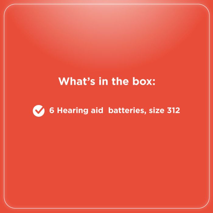 • Size 312 Zinc Air Batteries: Specially designed for hearing aids, ensuring optimal performance and reliability.